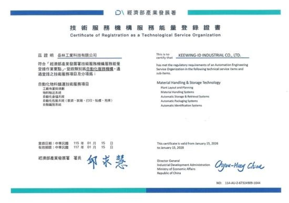 作為自動化物料儲運與健康照護自動化領域的領導者,岳林工業科技有限公司 (Keewing-ID Industrial Co., Ltd.) 以卓越的技術實力與穩健的服務品質,榮獲經濟部產業發展署兩項關鍵的「技術服務機構服務能量登錄證書」。